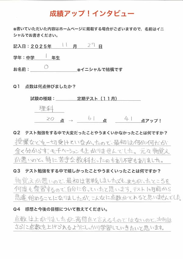 ⤴️11月定期テストで理科41点アップのOさん(中学1年生)❗️⤴️