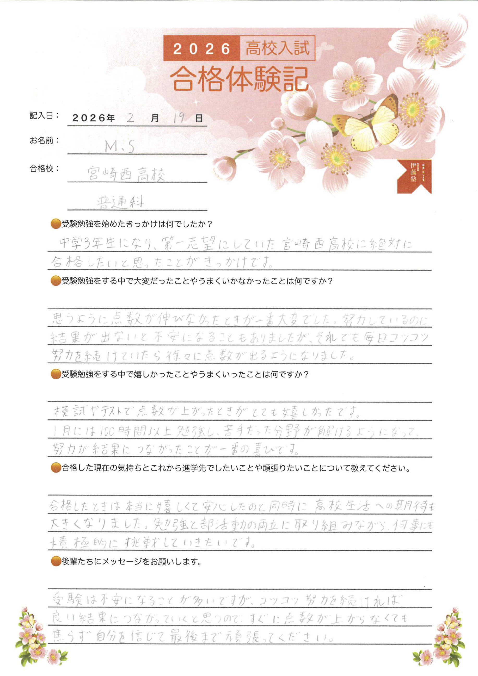 合格校:宮崎西高校 普通科(M.Sさん) 記入日:2026年2月19日